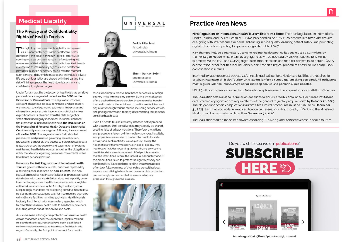 The article by Av. Feride and Av. Sinem on health tourism was published in the July issue of TLIR.
